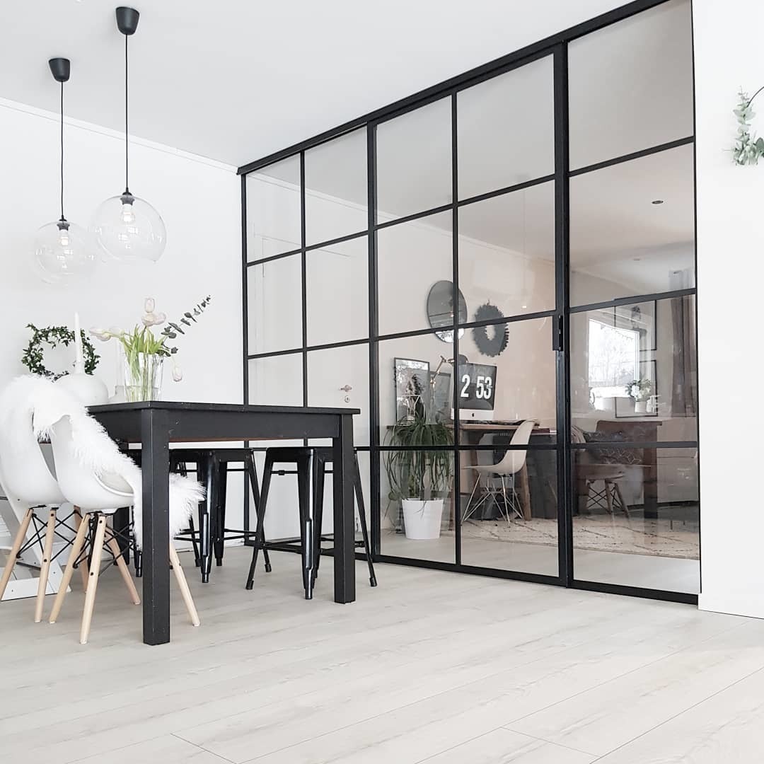 Da vi pusset opp huset (noe vi fortsatt holder på med ...) bestemte vi oss for å ha en smijernsvegg mellom kjøkken og TV-stuen. TV-stuen var opprinnelig et soverom, så vi rev en vegg og erstattet med denne glassveggen. Veggen er fra Stiil AS og de monterte den også for oss. Vi er fornøyd, men den må vaskes ofte da ;)